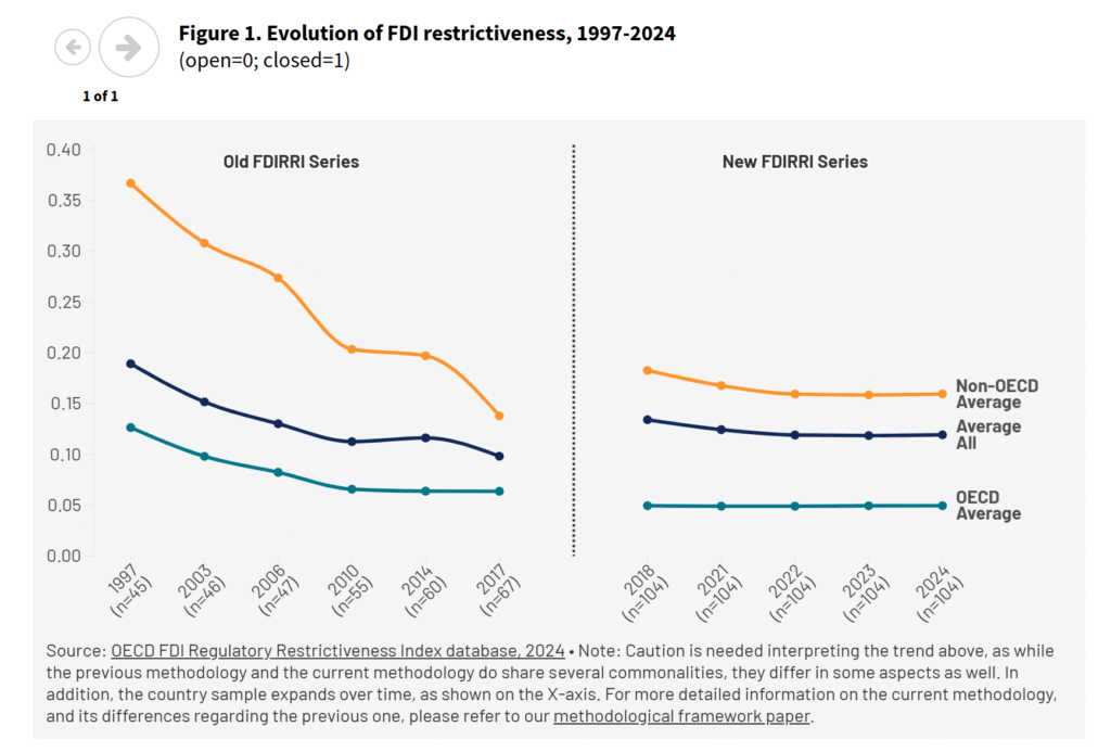 For the first time since 2018, global restrictions on foreign direct investment (FDI) have edged up, albeit only by a notch. The OECD’s FDI Regulatory Restrictiveness Index (FDIRRI) shows that average statutory barriers – e.g. foreign equity caps, foreign investment screening, restrictions on key foreign personnel and other restrictions – increased marginally in 2024, following decades of progressive liberalisation across OECD and non-OECD economies (Figure 1).